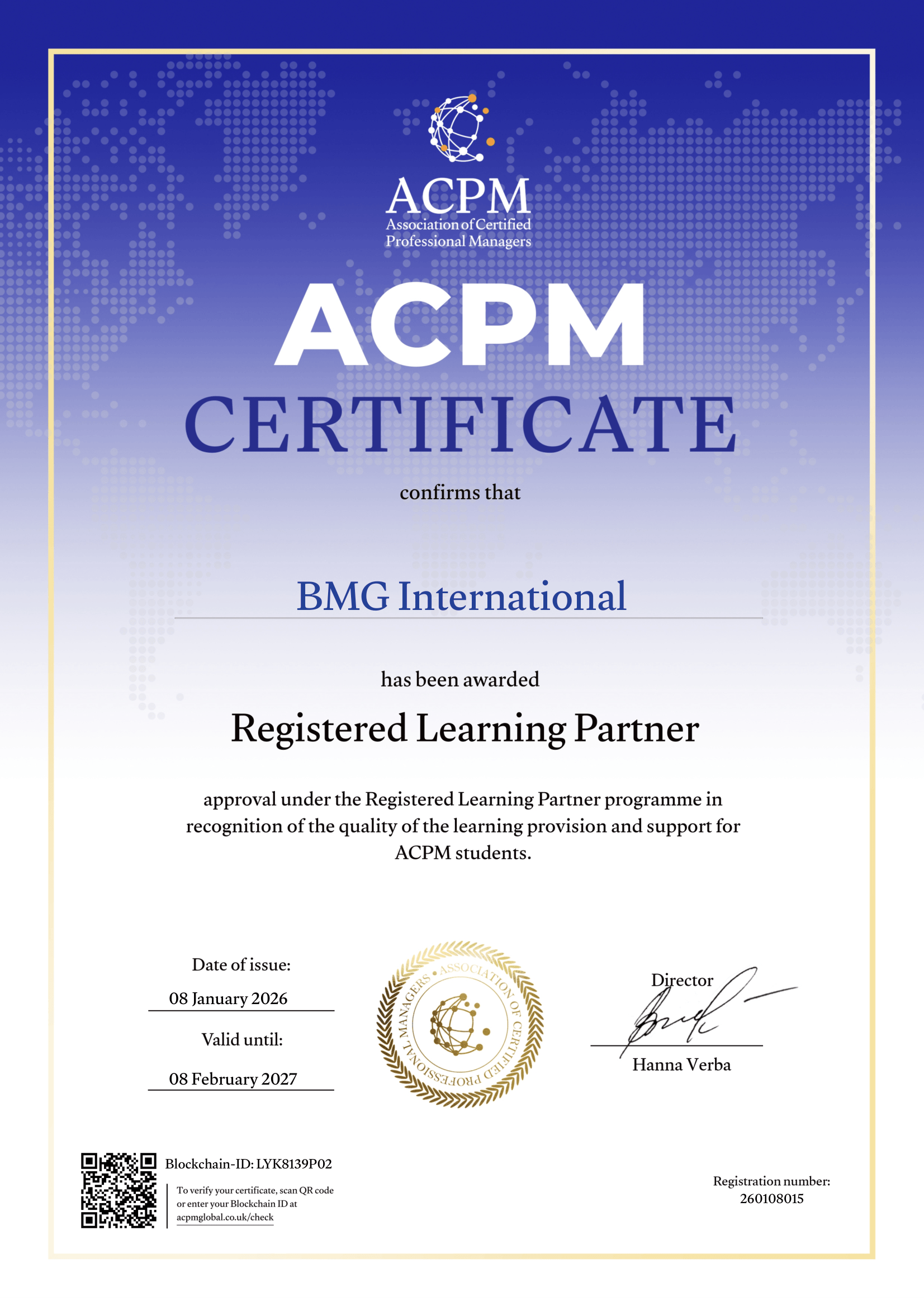 BMG International is an official Registered Learning Partner and regulator of partner activities in Azerbaijan, operating as a key regional representative of ACPM professional education standards. The organisation supports the development and implementation of internationally recognised professional programmes, ensuring that educational partners in Azerbaijan meet established quality requirements.