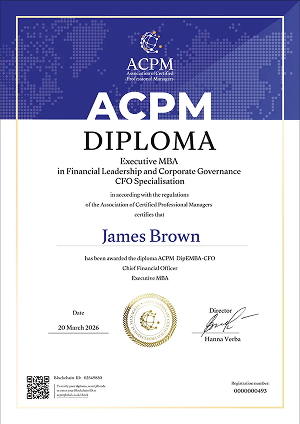 This diploma is awarded upon successful completion of Level 2 (Operational) and Level 3 (Management). Graduates are conferred the degree of Executive MBA in Financial Leadership and Corporate Governance (CFO Specialisation). This qualification confirms readiness to serve as a Chief Financial Officer (CFO) – a strategic leader responsible for financial management and the corporate financial policy of the company.