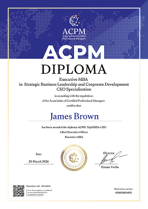 This diploma is awarded upon successful completion of Level 1 (Fundamental) and Level 4 (Strategic). Graduates are conferred the degree of Executive MBA in Strategic Business Leadership and Corporate Development (CEO Specialisation). This qualification confirms the ability to lead a company as Chief Executive Officer (CEO) – setting corporate strategy, overseeing comprehensive business management, and delivering top-level professional leadership.