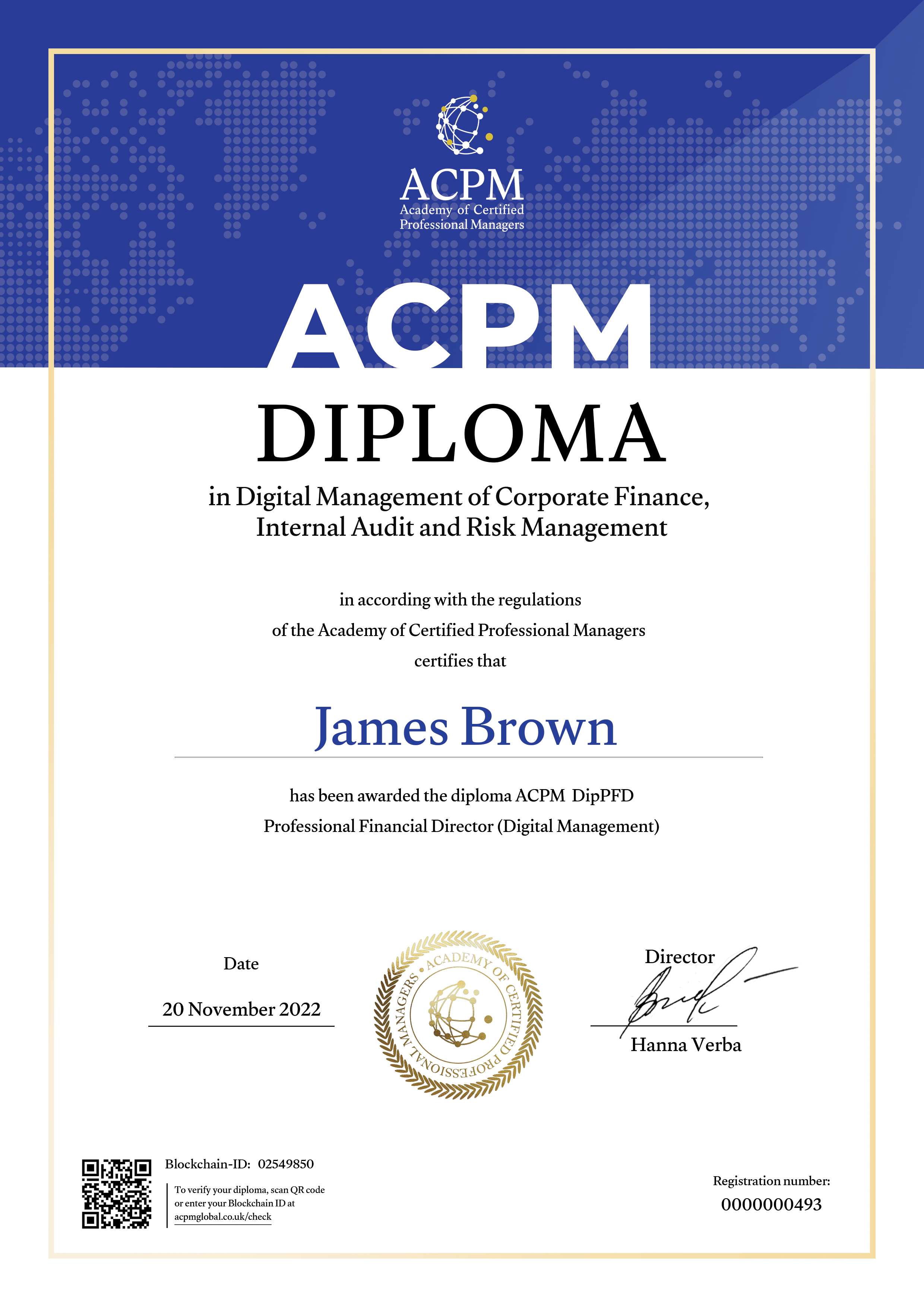 After receiving diplomas in the IFRS, Management accounting, and Internal audit programs, the candidate automatically receives the diploma of a professional financial director "ACPM: Professional financial director".
